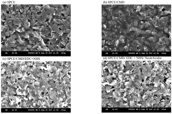 3.1.1. Characterization of Modified SPCE by Scanning Electron Microscopy (SEM)