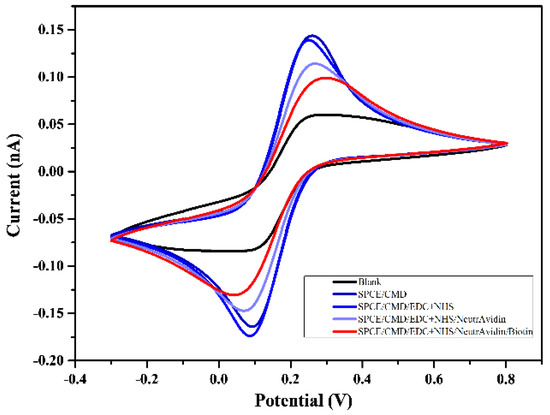 3.1.2. Characterization of ExomiR-SPCE by Cyclic Voltammetry