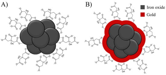 (A) Illustration of citrate-stabilized superparamagnetic iron oxide nanoparticles (Citrate-SPIONs); (B) gold-coated SPIONs (Au-SPIONs) which are also stabilized using citrate ions.