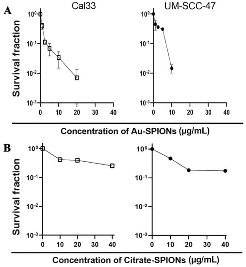SPIONs are stabilized on their surfaces to hinder nanoparticle agglomeration due to their high surface area. One of the simplest surface stabilizations is achieved by using citrate ions, which can bind covalently to the iron oxide surface through their carboxyl groups (Figure 1A) [,]. Enhanced functionality of the SPION surface can be achieved by a gold coating on the SPIONs (Au-SPIONs, Figure 1B), which can be easily functionalized with thiol-containing molecules [,]. This facile modification motif makes Au-SPIONs promising candidates e.g., for clinical use. To ensure a possible clinical use of SPIONs with ionizing irradiation (IR) it is important to know the biological behavior of the SPIONs. In particular, with regard to the cytotoxicity of the nanoparticles themselves and whether they cause damage in combination with IR. In this work, the effect of Au-SPIONs and Citrate-SPIONs on four different HNSCC tumor cell lines were studied. In addition, two healthy cell lines were also studied to determine if there were also effects on normal tissue cells. Cell death by apoptosis and necrosis and cell inactivation was primarily studied by the colony formation assay to score the effects on the survival fraction of tumor cells and normal tissue cells.