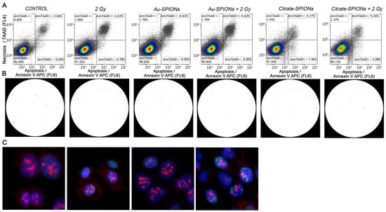 Cell death by apoptosis and necrosis were studied by staining the cells with Annexin V APC and 7 AAD. (Figure 5A). Cells were treated with 2.5 µg/mL Au-SPIONs and 40 µg/mL Citrate-SPIONs. Additionally, colony-forming assays were used (Figure 5B). DNA double-strand breaks (DNA dsbs) were determined by anti-γH2Ax and cell cycle phase by Ki-67 staining (Figure 5C).