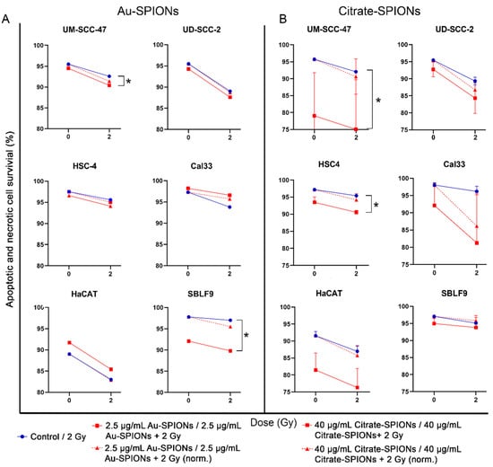 Induction of apoptosis and necrosis were stained with Annexin V APC and 7AAD to determine the differences in cell death of Au- and Citrate-SPIONs in different cell lines. All cell lines were treated with (A) Au-SPIONs or (B) Citrate-SPIONs. Survival decreased by apoptosis or necrosis under irradiation with 2 Gy (blue line) and a combination of irradiation and Au-SPIONs/Citrate-SPIONs (red line). The red dashed line is normalized to subtract out the cytotoxic effect of the nanoparticles to better indicate any additive effect. The graph depicts HPV+ cell lines in the top row, HPV- cells in the middle row, and healthy cells in the bottom row. Each experiment was repeated at least three times. Error bars indicate the standard deviation. * p-value ≤ 0.05.