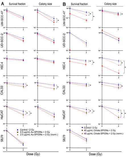 Survival fraction was determined by the colony formation assay. The cells were grouped in HPV+ (UM-SCC-47 and UD-SCC-2), HPV- (HSC-4 and Cal33) and healthy cells. Irradiation was indicated in blue and Au-SPIONs/Citrate-SPIONs in combination was indicated in red. The red dashed line is normalized to subtract out the cytotoxic effect of the nanoparticles to better indicate any additive effect. (A) shows graphs for Au-SPIONs and (B) Citrate-SPIONs. The graph depicts HPV+ cell lines (UM-SCC-47 and UD-SCC-2) in the two top rows, HPV- cells in the two middle rows (HSC-4 and Cal33), and healthy cells in the two bottom rows. Each experiment was repeated at least three times. Error bars indicate the standard deviation. * p-value ≤ 0.05.