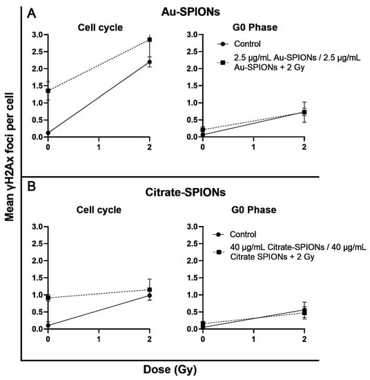 Cells were cultured on slides (up to 150,000 cells) for analyzing cell proliferation and DNA damage. Forty-eight hours later, the medium was exchanged, cells were treated with 2.5 µg/mL Au-SPIONs or 40 µg/mL Citrate-SPIONs in 1.5 mL medium and irradiated with 2 Gy after three hours. After treatment, the cells were incubated for 24 h at 37 °C. Then cells were fixed and permeabilized with 4% formaldehyde and 0.1% Triton X-100/PBS for 15 min and afterwards blocked with 1% BSA for 1 h at room temperature. For staining, the primary antibody mouse anti-γH2Ax (1:2500, Merck, Darmstadt, Germany) and the secondary antibody anti-rabbit Ki-67 (1:700, Abcam, Cambridge, UK) were used. DAPI was then added to stain the nucleus. Thereafter, Vectashield (Vector Laboratories, Burlingame, CA, USA) was applied to the slide and covered with a cover slip. Images were taken with a Zeiss Imager Z2 fluorescence microscope (Zeiss, Oberkochen, Germany). Electromagnetic convergence points (foci) generated with anti-γH2Ax were quantified using Biomas software.