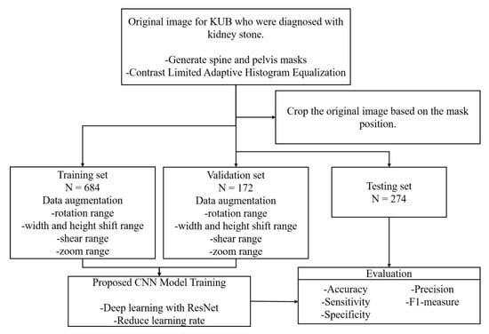 The protocol of the present study was approved by the Institutional Review Board of Kaohsiung Chang Gung Memorial Hospital. A total of 355 KUB images were retrospectively collected from 104 patients from Kaohsiung Chang Gung Memorial Hospital who were diagnosed with stones in their upper urinary tract. The presence of stones in the upper urinary tract shown in these 355 images was formally reported by radiologists and then confirmed on a case-by-case basis by two experienced urologists specializing in urolithiasis. The set of KUB images was first divided into groups of training images with single or multiple urinary tract stones, and the dataset was augmented through various image pre-processing operations to produce a total of 1130 images. Then, these 1130 images were divided into three datasets, with 856 images used to train the network, with 80% (684 images) allocated to the training process itself and 20% (172 images) for validation. The remaining 274 images were used to evaluate the performance of the trained model based on several metrics and to test its generalizability. A flowchart of the work performed in this study is shown in Figure 1.
