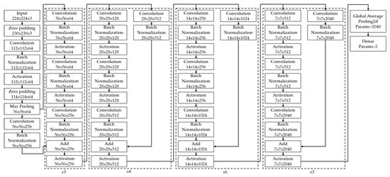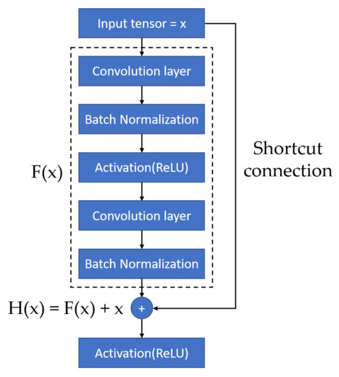 We adopted a ResNet-50 architecture as the CNN model in this study. Many studies have shown that the fineness of detail that can be extracted by a CNN increases with the depth of the network. However, He et al. (2016) demonstrated that performance degrades if the depth increases beyond a certain point [41]. Residual network (ResNet) architectures are based on residual blocks comprising convolutional, activation, and batch normalization (BN) layers F(x), and a shortcut connection that reproduces the input x. Because the output of a residual block is H(x) = F(x) + x, the layers in a traditional network effectively learn the difference between the true output and x, i.e., the residual, as shown in Figure 2. Therefore, for the simple case in which the network has not learned any features and the input is already optimal, F(x) is approximately 0, or H(x) = x (i.e., the identity relation). This solves the degradation problem and allows for extremely deep networks. The ResNet architecture is shown in Figure 3. By employing deep learning models for image classification, images can be automatically classified and labeled for various applications [42].