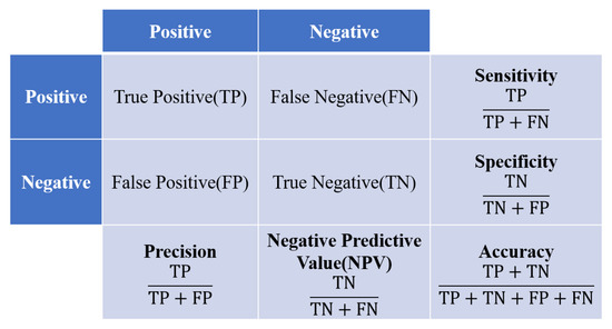 The data were divided into training, validation, and testing sets. The validation set was taken from the training set at a 20:80 ratio. The testing set consisted of 24% of the total data and was used to evaluate the accuracy of the trained ResNet model. The inputs of the image classification model consisted of images with a size of 224 × 224 px, and the urinary tract stone images were diversified using data augmentation techniques (random rotation, horizontal/vertical translation, magnification/zooming out, and shear-mapping). The Keras API with the Tensorflow platform (version 2.9.1) was used to construct the ResNet model. Ranger [43], which was created by combining RAdam [44] with LookAhead [45], was used as an optimizer. As with Adam, RAdam converges quickly and achieves a level of optimality similar to that of SGD. Furthermore, RAdam converges similarly with different learning rates, whereas Adam and SGD are much more sensitive to the learning rate and require optimization. Binary cross-entropy was used as a loss function. The predictions were used to construct a confusion matrix of four possible outcomes (see Figure 4). Correct predictions are either true positive (TP) or true negative (TN), whereas incorrect predictions are either false positive (FP) or false negative (FN). These outcomes were used to construct seven metrics to evaluate the performance of the model, including accuracy, sensitivity, specificity, precision, F1-measure, the receiver operator characteristic (ROC) curve, and the area under the ROC curve (AUC). Accuracy is defined as