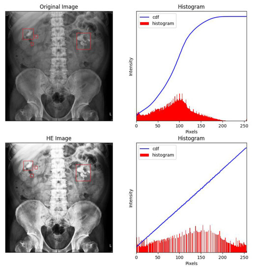 Studies based on data from seven countries (Italy, Germany, Scotland, Spain, Sweden, Japan, and the United States) have shown that the prevalence and incidence of kidney stones have been increasing globally [1,2,3]. To address this problem, various methods have been developed to detect and treat kidney stones [4,5]. Computed tomography (CT) is a particularly accurate diagnostic method, with sensitivity and specificity ranging from 94% to 100% and 92% to 94.2% for kidney stones, respectively [6,7]. Therefore, CT is the gold standard for kidney stone diagnosis. However, CT is costly and requires a higher radiation dose than plain film X-ray imaging. For example, the radiation dose of an abdominal CT scan ranges from 8 to 34 mGy [8,9], in contrast to the lower dose of 2.47 mGy required to record a kidney–ureter–bladder (KUB) image [10]. Similarly, a stomach CT requires 50 times the radiation dose of a plain film stomach X-ray [11]. Although low-dose CT reduces the radiation dose from 25 to 17 mGy for abdominal CT scans, this value is still higher than that of plain film X-ray imaging [12]. Therefore, plain film X-ray imaging may be considered as a cost-effective alternative to CT, which also causes less harm to the body. However, X-ray images also have a propensity for false positives owing to their 2D nature, and their resolution does not suffice to identify abnormalities in dense tissues [13]. For example, KUB images have sensitivities of only 44–77% and specificities of 80–87% in kidney stone detection [14], which are considerably inferior values compared to those of CT. Improving the sensitivity of KUB imaging for use with kidney stones could therefore allow Χ-ray scans to be used as a widely applicable option to diagnose the condition, which would also reduce medical costs.