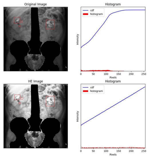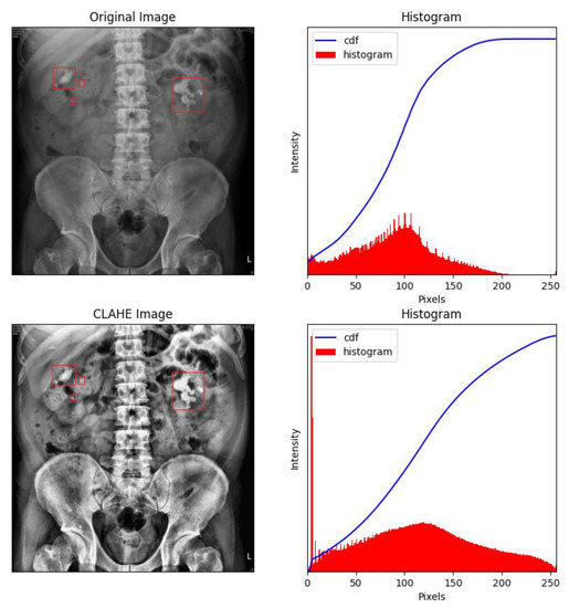 Contrast-limited adaptive histogram equalization (CLAHE) of a KUB image. It can clearly be observed that CLAHE greatly reduced overexposure around the rib cage, which makes identifying kidney stones relatively straightforward. The renal stones were labelled with red frames by the experts.