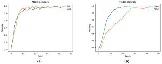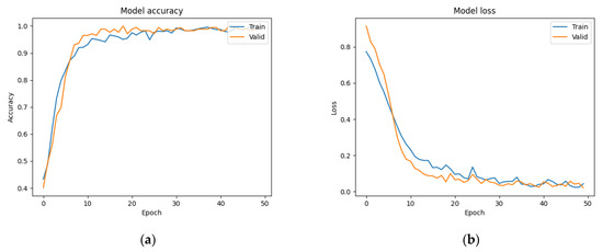 We trained the ResNet model using both augmented and non-augmented datasets. Data augmentation was performed by rotating, horizontally and vertically translating, magnifying/shrinking, and shear-mapping the original images. In the augmented dataset (which contained the same number of images as the non-augmented dataset), these data augmentation procedures were randomly applied to every image after each iteration to ensure that the training data differed between iterations. The results were then compared in terms of accuracy and loss. Figure 8a,b show the results obtained with and without data augmentation, respectively. Although the accuracy increased much more rapidly when the model was trained on the non-augmented dataset, it was unable to obtain a similar level of accuracy on the validation dataset in that case.