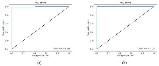 The model was trained for 50 epochs with an initial learning rate of 10−5. Because appropriate decreases to the learning rate are conducive for optimization, the learning rate was multiplied by 0.5 if the validation loss was not updated for five continuous epochs. The epoch-wise changes in accuracy and loss are shown in Figure 9a,b, respectively. It can be observed that the process of training from 0 epochs to 20 epochs converged rapidly. The accuracy and loss of the training set and the verification set were close, indicating that the model learned features in the initial stage well and classified them accurately. The subsequent loss from the 20th to the 50th epochs gradually converged to the optimal solution as the training ended. According to the confusion matrix shown in Table 1, the final accuracy of the model was 0.977, and its accuracy on the testing set was 0.982. Sensitivity is the ratio of patients with kidney stones who were correctly identified as positive cases, while precision is the ratio of correct diagnoses among positive cases. Therefore, a high sensitivity implies that false negatives are rare. Specificity is the ratio of patients without kidney stones who were correctly diagnosed as negative cases. Therefore, a model with a high specificity is unlikely to misdiagnose healthy subjects as positive cases. The F1-measure is the harmonic mean of recall (sensitivity) and precision, which summarizes the performance of a model. In kidney stone classification, the focus is on sensitivity, as the primary goal is to correctly identify patients who suffer from kidney stones. The sensitivity, specificity, precision, and F1-measure scores of our model were 0.953, 1, 1, and 0.976 on the validation set and 0.964, 1, 1, and 0.982 on the testing set, respectively (see Table 2). The ROC curves were also plotted to test the effectiveness of the model, and their AUCs were 0.995 and 1 on the validation and testing sets, respectively (Figure 10a,b). When AUC > 0.5, the classification performance of a classifier is better than random guessing, and the model has positive predictive value. The AUC value of our model was quite close to 1, which shows that the performance of our model was close to that of a theoretically perfect classifier, and it was effective in predicting positive samples correctly.