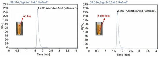 The potency of ascorbic acid in the lipid-based formulation of vitamin C was measured by UHPLC equipped with a DAD detector, at a wavelength of 245 nm. Table 2 indicates the concentration of vitamin C from the top and bottom regions of the sample tube (cf. inset in Figure 2a,b); the vitamin recovery values were 97.38% and 91.86%, respectively. Based on these results, the sample was homogenous, and did not show any significant phase separation; however, the concentration of the top portion was greater than the bottom region. According to Health Canada’s regulation of Natural Health Products, a variation of 20% in composition is allowed for industrial production of such vitamin formulations.