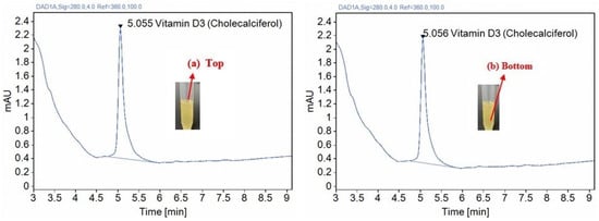 The potency of cholecalciferol in liposomal vitamin D3 was assessed by UHPLC equipped with a DAD detector, at a wavelength of 280 nm. Table 3 shows the concentration of vitamin D3 determined from the top and bottom regions of the sample tube (cf. insets in Figure 3a,b); the vitamin recovery values were 100.95% and 96.73%, respectively. Based on these results, the sample was homogenous, and did not display any notable phase separation. According to Health Canada’s regulation of Natural Health Products, a variation of 20% in composition is allowed for industrial production of such vitamin formulations.