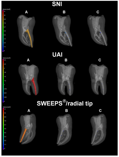 All samples were scanned three times using a μCT) device (XT H 225; Nikon, Tokyo, Japan): after root canal filling (Volume I), after root canal retreatment (Volume II), and after the experimental final irrigation protocol (Volume III).