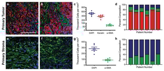 Staining and cellular quantification of primary breast cancer resections. Primary breast cancer patient resections were stained for breast cancer cells (anti-pan keratin; red), activated fibroblasts (anti-αSMA; green), and total cells (DAPI; blue). The number of positively stained cells for each channel was counted in five random regions in order to determine the cell densities and percent compositions within the tumor (a–d) and within the stroma (e–h) for six patients (n = 6). Scale bar = 200 μm.