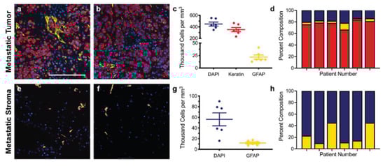 Staining and cellular quantification of metastatic breast cancer resections. Breast cancer brain metastases patient resections were stained for breast cancer cells (anti-pan keratin; red), activated astrocytes (anti-GFAP; yellow), and total cells (DAPI; blue). The number of positively stained cells for each channel was counted in five random regions in order to determine the cell densities and percent compositions within the tumor (a–d) and within the stroma (e–h) for six patients (n = 6). Scale bar = 200 μm.