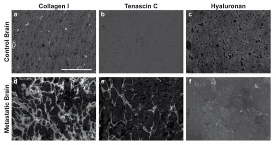 Breast cancer brain metastases exhibit remodeled extracellular matrix. Non-cancerous control brain resections (a–c) and breast cancer brain metastases resections (d–f) were stained for collagen I (anti-collagen I), tenascin C (anti-tenascin C), and hyaluronan (hyaluronic acid binding protein). Representative images were selected across six patients (n = 6). Scale bar = 200 μm.