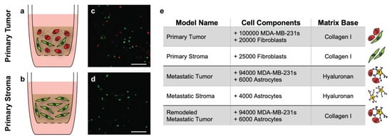 Tissue-engineered model parameters. Graphical depictions of the primary tumor and stroma models indicate the cellular and matrix components within each (a,b). Representative cross-sectional images of the models 18 h after formation show successful incorporation of labeled fibroblasts (green) and MDA-MB-231 breast cancer cells (red) (c,d). Scale bars = 200 μm. Summary of the cell components and matrix base for each of the corresponding tissue-engineered models (e).