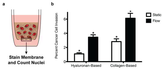 Extracellular matrix composition and fluid flow affect breast cancer cell invasion. MDA-MB-231 breast cancer cells were seeded into collagen-based or hyaluronan-based gels within tissue-culture inserts (a). After 18 h, percent invasion was calculated by dividing the number of cells in the insert membrane by the number of seeded cells (b). A two-way ANOVA and Bonferroni comparison test were performed to determine statistical significance (* p < 0.05). Error bars represent standard deviation (n = 3).