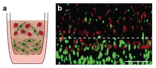 Layering of primary tumor and primary stroma models. Schematic of multi-layered breast cancer model (a). MDA-MB-231 breast cancer cells were labeled with CellTracker Deep Red and fibroblasts were labeled with CellTracker Green prior to use. A three-dimensional image was obtained of the boundary between the top tumor model and bottom stroma model 18 h after gel formation (b). Gel orientation remained intact after fixation and removal from the tissue-culture insert. Breast cancer cell invasion from the tumor layer into the stroma layer can be seen, indicating that cells were able to migrate through the gel boundary. Scale bar = 200 μm.