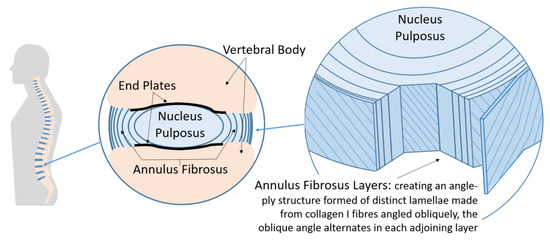 Low back pain is among the leading causes of disability in the world [1]. Injury or degeneration of intervertebral discs (IVDs) in the spine can be a cause of this disability. The IVD has a complex structure to enable the biomechanics of human movement. The IVD consists of a central nucleus pulposus, an irregular meshwork of collagen II fibrils with an osmotic swelling pressure created by large amounts of proteoglycan aggrecan aggregated along chains of hyaluronan. This is surrounded by the annulus fibrosis, collagen I fibers oriented in oblique angles in a heterogeneous structure in distinct lamellae, with the collagen fibers laid up in alternating oblique angles in each consecutive lamella to form an angle-ply architecture [2,3,4,5,6]. The IVD structure is illustrated in Figure 1.