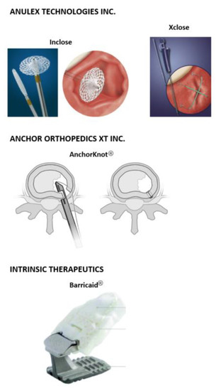 The Inclose Surgical Mesh System and the Xclose Tissue Repair System (Anulex Technologies, Inc. Minnetonka, MN, USA) were both commercially available and marketed as annular closure devices (Figure 2, top); both devices received US Food and Drug Administration (FDA) 510(k) clearance in 2005 and 2006, respectively [36,38]. The Inclose system consisted of an expandable braided mesh-like patch and two polyethylene terephthalate (PET) suture tethers (Anchor Bands by Anulex Technologies Inc., Minnetonka, MN, USA). Evidence of the safety and use of Inclose is limited; no peer-reviewed literature is available at the time of publication of this article. On the other hand, the Xclose Tissue Repair System was more widely used as an annular closure device. However, this device was not demonstrated to significantly reduce reherniation rates [50]. Both systems were withdrawn from the market after multiple complications were reported [33].