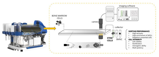 The microfluidic system demonstrated an optimal sorting resolution with 75% of cell recovery while preserving viability and proliferative and multipotent cell characteristics. The system was continuously running to obtain a high cell number, and it did not affect the sorting performance. The preservation of stem cell integrity and potential is imputed to the low mechanical and shear stress during the separation process.