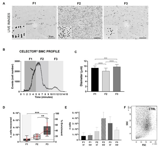 Label-free separation of fresh bone marrow cells. (A) Representative images from F1, F2, and F3 captured during the analysis (screenshots) (scale bar 50 µm). F1 presents many cell aggregates; in F2, RBCs are predominant, and have a more defined surface in F3 cells. (B) Representative Celector® profile of fresh BMC. Fractogram represents the number of counted cells in correlation with the elution time in minutes. Unretained cells and debris elute at around 1 min and were discarded. Time intervals of the three collected fractions are shown in the fractogram graph (F1: 1–5 min; F2: 5–9 min; F3: 9–14 min). (C) Cell diameter measurement of eluting cells using ImageJ software and “analyze particles” plugin. Three screenshots per fraction were used and diameter is expressed in µm. Cell aggregates were excluded to obtain only single-cell dimension and F1 cells had a diameter of 9 µm; F2 cells, mostly RBCs, had a diameter of 8 µm; and F3 had a diameter of 9.7 µm. (D) Graph representation of the average cell recovery for each fraction for 8 samples analyzed and the percentage of cell enrichment of each fraction compared to the total number of cells injected into the system. Recovery and enrichment raised from F1 to F3. (E) Quality-control feature of counting software of Celector® to identify cell recovery for a specific fraction. Cell number of each fraction was measured by the integral of the area designed by the profile (cells vs. time) (F1-2-3 sw) and compared to cell number from crystal violet count (F1-2-3 cr). Every run of each individual was calculated and then average was graphed. Cell count for F1 was very similar between the two systems while F2 cell counted by the software (F2 sw) was higher due to presence of RBCs which are not manually counted by Crystal violet staining. F3 sw count gave a lower number because of a technical limitation of miscalculation due to closing eluting cells which were considered single cells instead of a group. (F) Flow cytometry data of fresh BMC show great heterogeneity among cells. No distinct populations were observed if only physical parameters were used. All data are represented as mean ± SD, multi-parametric one-way ANOVA test: ** p < 0.01, *** p < 0.001, **** p < 0.0001.