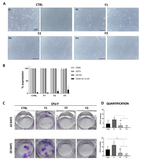 Collected cells from each fraction and CTRL were expanded in culture to assess their morphology and proliferation. Morphological difference was noted among cells from different fractions. F1 cells resembled CTRL cells (Figure 4A(i)), with a typical fibroblastic-like shape and growing in colonies (Figure 4A(ii)). F2 cells still expressed fibroblastic-like shape and an arrangement of spiral-shaped growth (Figure 4A(iii)), while F3 cells looked different with a wider cytoplasm, irregular contour and long pedicles extruding from the cell body (Figure 4A(iv)). One of the main observations was the number of adherent cells per fraction: F1 contained more adherent cells and grew faster in culture, so it probably contained the most proliferative clones; few cells from F2 attached to the plate and slowly grew, whereas only a couple of cells from F3 adhered to plastic and had a slow replicative pace. F1 cells reached confluence in 20 days, like CTRL, while F2 and F3 cells reached less than 50% of confluence in approximately 40 days.