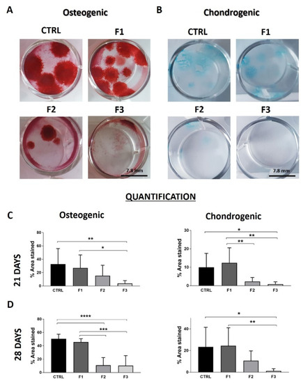 Differentiation into osteogenic and chondrogenic lineage for cells derived from F1, F2, F3, and CTRL. (A) Representative images of Alizarin staining for the osteogenic differentiation after 28 days of culture in differentiation medium. (B) Alcian blue staining for proteoglycan formation in cells derived from F1, F2, F3, and CTRL after 28 days of culture. Semi-quantitative analysis was performed measuring stained area by Image J software. Results were calculated for differentiation for osteogenic and chondrogenic differentiation after 21 days (C) and 28 days in culture (D) (mean ± SD, multi-parametric one-way ANOVA test: * p < 0.05; ** p < 0.01, *** p < 0.001, **** p < 0.0001).