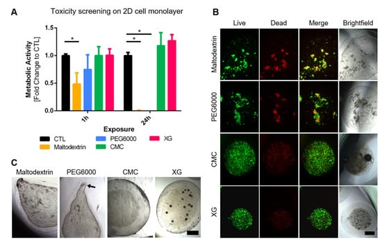 (A) Toxicity screening of thickening agents; adherent MSCs in 2D monolayer culture were exposed for 1 and 24 h to culture medium containing thickening agents at above stated concentrations; measurement of metabolic activity revealed significant decrease in maltodextrin and PEG6000 groups in comparison to controls treated with standard cell culture medium (n = 4, multiple t-test analysis, significance determined using Holm–Šídák method, α = 0.05); (B) live/dead staining of encapsulated MSCs 24 h after encapsulation; irregular capsule shells and cell clumps with high number of dead cells in PEG6000 and maltodextrin samples, good distribution, and high number of viable cells in CMC and XG samples (scalebar = 500 µm); (C) representative brightfield images of blank capsules produced with 4 different thickening agents (maltodextrin—66.6%, polyethylene glycol PEG6000—20%, carboxymethylcellulose CMC—1.5%, xanthan gum XG—0.3%), first two resulted in “tadpole”-shaped capsules, often not completely closed (black arrow), whereas last two showed good results (scalebar = 500 µm).