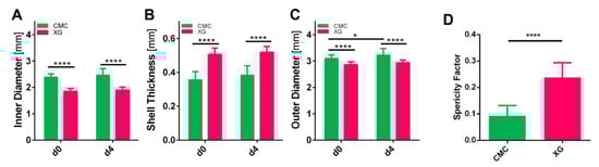 (A–C) Measurements of alginate capsule dimensions produced with CMC or XG: inner diameter (A), shell thickness (B), and outer diameter (C), measured on days 0 and 4 (n = 30, two-way ANOVA, significance determined using Tukey’s multiple comparisons test, α = 0.05); (D) sphericity factor (see Equation (2)) calculated for capsules (n = 30, students t-test, α = 0.05).