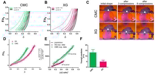 Dimensionless force-displacement curves for 6 loading and unloading cycles of CMC (A) and XG alginate capsules (B); (moving average, n = 3), (C) representative images of capsules during cyclic compression; the initial shape as well as the permanent deformation after multiple compressions can be seen; (D) dimensionless force-displacement curves of CMC and XG capsules (n = 3); (E) comparison of experimental data to theoretical prediction according to Equation (3) from which (F) Young’s modulus of the capsules was determined.