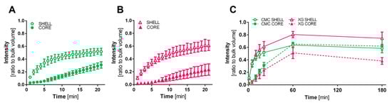 Diffusion of 4 kDa FITC-labelled dextran into shell and core of alginate capsules at 20 °C; (A) CMC containing capsules and (B) XG containing capsules in the first 20 min, presented as ratio of average fluorescence intensity of shell and core region to bulk volume intensity; for both conditions an initial increase in the shell material that starts to flatten after 5 min; diffusion into the core is delayed for both conditions, for the time it takes for the dextran to pass through the shell material, (n = 3); (C) diffusion properties over 3 h; core and shell of CMC capsules reach a common plateau of ~60% compared to bulk intensity already after 60 min; although the alginate shell of XG containing capsules shows intensity values between 70 and 80% for their plateau, the core region did not reach the same intensity after 3 h.