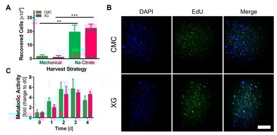 (A) Number of cells recovered from 1 g of capsules using different harvesting approaches; capsules were either mechanically disrupted, cell aggregates enzymatically disassociated and passed through cell strainer to remove alginate shell fragments or dissolved by addition of 0.1 M Na-citrate followed by enzymatical cell aggregates disassociation (n = 3, students t-test, α = 0.05); (B) representative images of EdU proliferation staining between d2 and d4 of cultivation, blue—DAPI: stains all nuclei, green—EdU-488: stains nuclei of proliferating cells, in both groups proliferating cells after initial compaction phase were detected (scale bar = 500 µm); (C) metabolic activity of encapsulated adMSCs measured daily, an initial increase can be seen until day 2 where values stayed constant (XG) or decreased (CMC) towards day 4 (n = 6, normalized to d0).