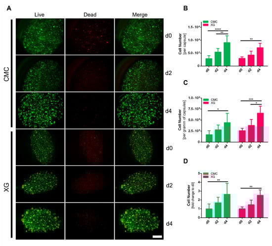 To determine the actual cell numbers within the different capsules, we also recovered them using the previously described method using Na-citrate to dissolve the shell material. The cell number within the capsules increased significantly for both types. Although no significant difference could be determined between CMC and XG as internal matrix on day 4, with 9.05 ± 2.65 × 103 cells/capsule slightly more could be recovered from CMC capsules compared to 7.07 ± 1.69 × 103 cells/capsule from XG ones (Figure 7A). This is not surprising, as previously determined, the capsules differ significantly in size. Therefore, as is common with microcarriers, the number of cells per gram of capsules can be seen in Figure 7B. Moreover, here only a trend and not statistically significant differences between CMC (4.43 ± 2.10 × 105 cells/g capsule) and XG capsules (6.56 ± 1.60 × 105 cells/g capsule) can be seen, however now in favor of XG as thickening agent. Looking at the overall fold change of cell numbers throughout the four days of cultivation, also considering the production yield of capsules per mL of cell suspension (CMC: 3.83 ± 0.79 XG: 3.12 ± 0.30 g capsules/mL cell suspension), the cells within the two capsule types presented a 2.6-fold (2.64 ± 1.25) and 2.5-fold (2.53 ± 0.62) change for CMC and XG, respectively. No clear advantage could be quantified for one or the other core materials, reinforcing that both thickening agents are suitable for encapsulation of adMSCs in this approach.