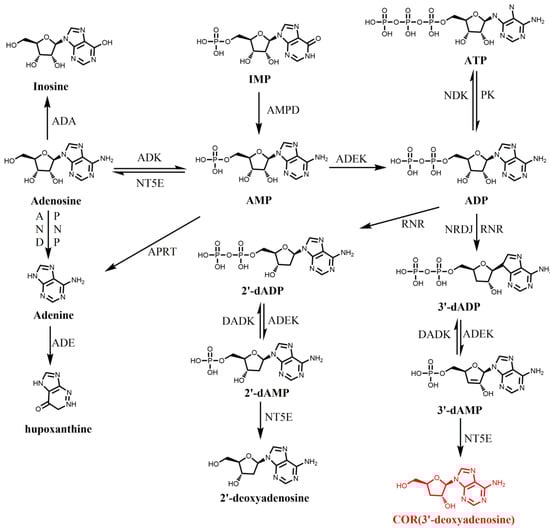 - Kredich, N.M.; Guarino, A.J. Studies on the biosynthesis of cordycepin. Biochim. Biophys. Acta 1961, 47, 499–535. [Google Scholar] [CrossRef] [Green Version]