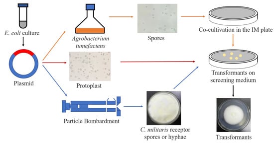 - Zheng, Z.; Huang, C.; Li, C.; Xie, C.; Han, R. Agrobacterium tumefaciens-mediated transformation as a tool for insertional mutagenesis in medicinal fungus Cordyceps militaris. Fungal Biol. 2011, 115, 265–274. [Google Scholar] [CrossRef] [PubMed]