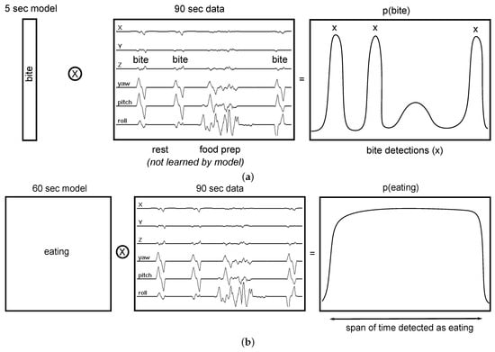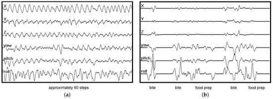 Eating is a complex task with high variability compared to some other human activities of daily life, such as walking or running. Figure 1a shows an example of 90 s of IMU data (accelerometer x, y, z, gyroscope yaw, pitch, roll) recorded by a wrist-mounted sensor while the subject was walking. Walking causes cyclical oscillations that can be easily recognized in a brief window of data. Figure 1b shows an example of 90 s of IMU data recorded by a wrist-mounted sensor while the subject was eating. Three bites (moments of ingestion) are labeled, along with two periods of food preparation (e.g., cutting and stirring). Eating tends to show large wrist rotation motions with smaller linear motions, which helps recognition []. However, general eating has more complexity and variability than walking, and thus requires more sophisticated methods for recognition.