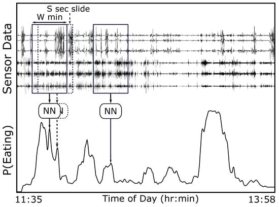 Neural network (NN) classifiers are having a tremendous impact in the fields of computer vision, healthcare, and human activity recognition [,,]. However, a recent survey of research in automated dietary monitoring found only five works that used deep learning []. Fontana et al. [] extracted 68 features over 30 s windows from multiple sensors (jaw motion sensor, hand proximity sensor, chest accelerometer), and then processed this information using an NN []. Gao et al. extracted 18 features from sound data collected by off-the-shelf Bluetooth earphones to detect periods of eating []. Both these methods first extracted features using traditional techniques and then used an NN for classification. Kyritsis et al. developed an end-to-end deep learning approach using wrist motion data []. It uses two neural networks. The first network detects sub-components of hand-to-mouth gestures (raising hand, lowering hand, etc.), while the second network recognizes complete hand-to-mouth gestures (henceforth called bites). Experiments conducted in a laboratory setting found that the method could detect bites with an F1 score of 0.91 []. In more recent work, they tested an end-to-end network in free living conditions []. A convolutional neural network (CNN) was trained to look at 5 s windows of IMU data and predict the probability of the window containing a bite. Hypothesizing that the density of detected bites is high during meals, and low outside periods of eating, they identified periods of time during the day as eating with 95% weighted accuracy on their own dataset [] and 79% on a larger dataset [].