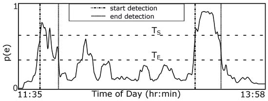 We identify periods of eating using a hysteresis-based detector to reduce the effect of noise in the signal []. The pseudo-code for the detector is shown in Algorithm 1. The inputs are , the probability of eating at time t output by the NN, and and , the hysteresis thresholds. The output is s, the count of detected episodes, and the arrays and denoting the detected boundaries. When rises higher than (start threshold), we mark the start of a detected eating episode. When drops to less than (end threshold), we mark the end of an eating episode. The use of two thresholds serves two purposes. First, it helps to reduce false positives by requiring a strong probability (>) for at least part of the detection. Second, it helps to improve boundary precision by allowing for a weaker probability at the end of the detection. Eating can sometimes be more vigorous at the beginning of a meal, fading with satiety [,]. For example, a person may slow eating with fewer ingestion events towards the end of a meal. The second threshold allows for a lower probability towards the end of a detected episode. Finally, as all meals in CAD are longer than 1 min in length, we combine any two segments that are within 1 min of each other, and remove any segments shorter than 1 min to help avoid oversegmentation.
