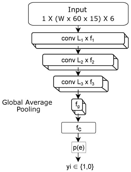The input to the CNN is W min ( s) of 6-axis motion data. Our first convolutional layer uses 1D kernels, each of length units equivalent to 3 s of data at 15 Hz. The second convolutional layer uses 1D kernels of length . The third layer uses 1D kernels of length . The resulting layer is pooled using global average pooling to numbers, which feeds into a fully connected layer with units. The last layer contains 1 unit activated by the sigmoid function.