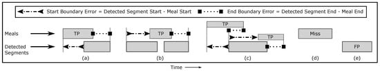 Boundary metrics describe success at identifying when eating episodes started and ended []. The unit is minutes. They are only calculated for meals that are TPs (Figure 6). We report the average difference between the meal start time and detected segment start time as the start boundary error, and the average difference between the meal end time and detected segment end time as the end boundary error. In the special case of self-reported meals overlapping multiple detected events (Figure 6b,c), for each self-reported meal, we use the start/end of the first/last overlapping detection.