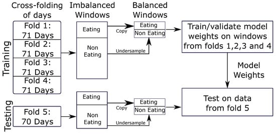 We use 5-fold cross-testing for validation of our model. Cross-fold validation reduces potential bias in the selection of the test set []. The model is trained on 80% of the data and tested on the remaining 20% of data. This is repeated five times, changing which 20% of the data is excluded during training and used for testing. The data were split by subject so that all data from the same subject were used either in training or testing. Figure 7 outlines the cross-validation process used, which consists of cross-folding, window cutting, and data balancing for model training and validation.