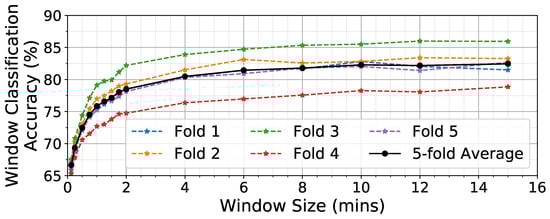 A CNN is trained to process W minutes of data and generate the probability of eating . Figure 8 shows the effect of varying W on the accuracy of classifying individual windows. Large window sizes (4–15 min) yield much higher classification accuracy (81–82%) than small window sizes (7.5–15 s, 66–69%). Previous work in human activity recognition has found a similar improvement as window size increases in identifying periods of time containing walking []. This result demonstrates that analyzing large windows of time to detect wrist motions associated with eating provides greater accuracy compared to analyzing a smaller window that seeks to detect individual hand-to-mouth gestures. We believe that this is because longer windows have additional important context on what happens between ingestion events. For evaluation of the detector at the eating episode level, we selected the value W = 6 min because larger window sizes did not produce a notable increase in NN accuracy. This is likely due to a tradeoff between analyzing a long enough period of time that it covers intergesture sequencing that occurs while eating [], while at the same time not extending too long and thus capturing gestures that are outside the meal period (especially for short eating episodes such as snacks).