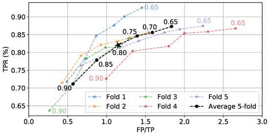 Effect of (numbers next to lines) on TPR and FP/TP while keeping W = 6 min and = 0.3 fixed. ⋆ indicates selected value.