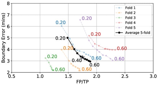 The hysteresis-based segmenter uses thresholds and to identify periods of time considered eating activity. Combined, window size W, , and can be considered hyperparameters. To search the hyperparameter space for W, , and , we use average cross-validation scores, as recommended in [,]. The advantage of a cross-validated search compared to a single train/validate/test search is that it generalizes better by evaluating multiple splits of the data []. The three hyperparameters have a complex interaction with the performance metrics TP, FP, and boundary error, and so we tune one hyperparameter at a time in relation to its most relevant performance metrics.