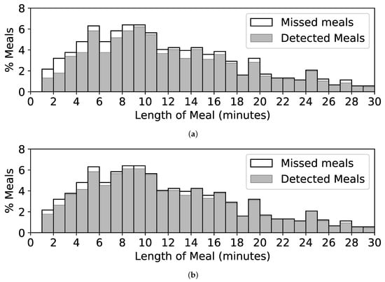Histograms showing lengths of self-reported meals in CAD and the percentage of meals detected. (a) Detected and missed meals when using W = 6 min, = 0.8, and = 0.4. (b) Detected and missed meals when using W = 2 min, = 0.75, and = 0.55.