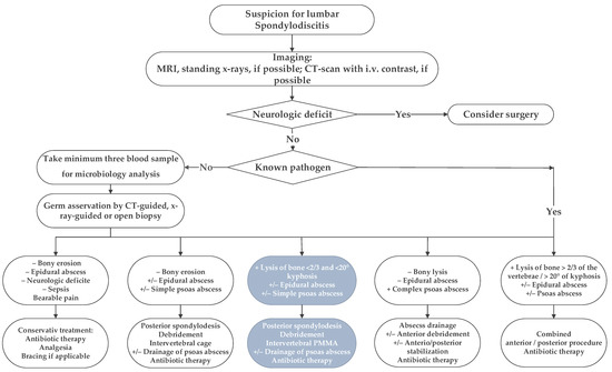 - Zarghooni, K.; Rollinghoff, M.; Sobottke, R.; Eysel, P. Treatment of spondylodiscitis. Int. Orthop. 2012, 36, 405–411. [Google Scholar] [CrossRef]