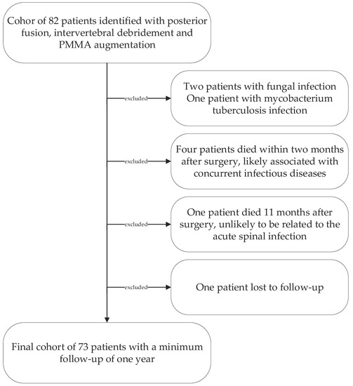 Following institutional ethics board approval, we retrospectively reviewed all patients’ records treated surgically for lumbar pyogenic erosive spondylodiscitis between 2000 and 2017. According to our treatment algorithm for pyogenic spondylodiscitis (Figure 1), inclusion criteria for surgery were the failure of conservative treatment, defined by progressive segmental instability presenting increasing segmental kyphosis ≥5° combined with bony destruction, or not responding to antibiotic therapy. According to Boody and Saeed, further indications for surgery were an epidural abscess with neurological impairment, uncontrolled sepsis despite antibiotic treatment, progressive paraspinal abscess, or immobilizing pain [1,6]. Patients with the following conditions were excluded: non-pyogenic infections, under 18 years of age, active tumor disease, complete vertebra resections, concurrent multiple psoas abscesses not possible to treat by punctuation or conservatively, sacroiliac joint involvement, and those who did not consent for data analyses. Finally, 73 patients were included (Figure 2).
